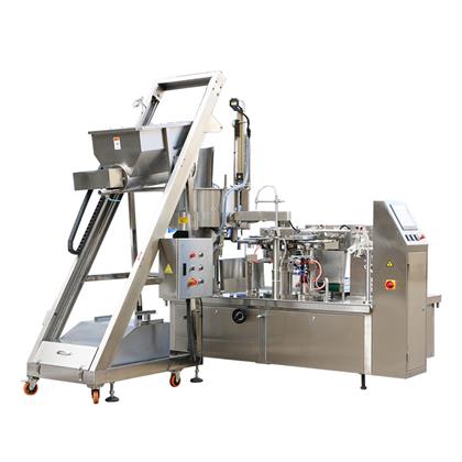 2.旋轉全自動給袋式真空包裝機由兩種分離的旋轉式機體組成(分別為充填系統(tǒng)和真空系統(tǒng)).充填系統(tǒng)為間歇式旋轉運轉,真空系統(tǒng)為連續(xù)式旋轉運動。